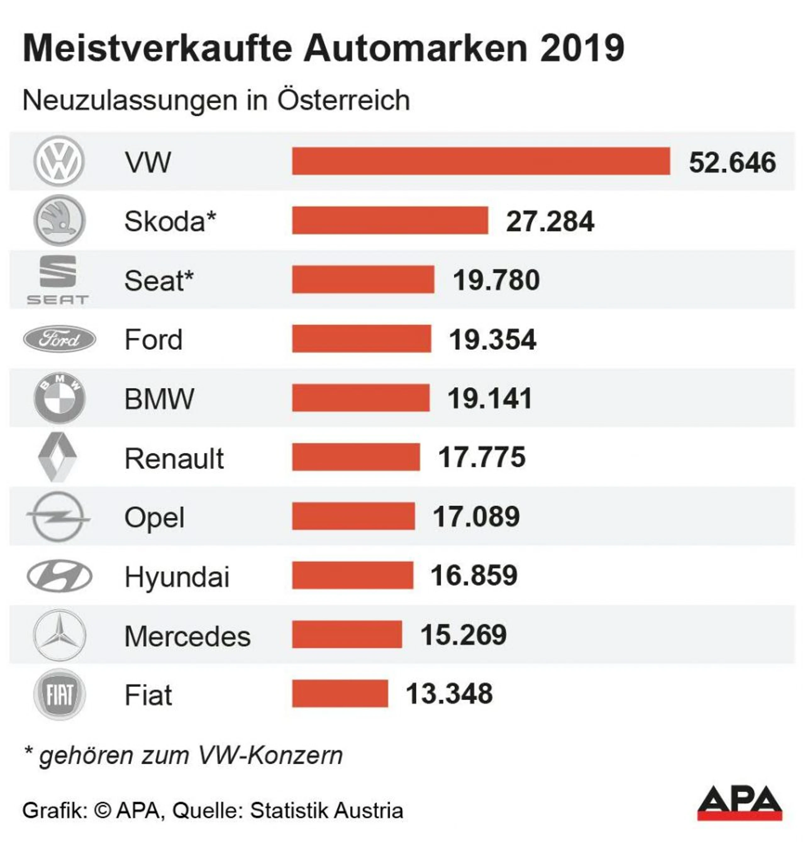 Die beliebteste Automarke in Österreich blieb auch 2019 Volkswagen, mit einem Marktanteil von 16 Prozent wurde aber ein Rückgang um 7,5 Prozent gegenüber verzeichnet. Insgesamt wurden im Vorjahr 52.646 VW neu zugelassen. Dahinter folgt Skoda mit 27.284 Neuzulassungen, relativ gleichauf liegen auf den Plätzen drei bis sechs Seat, Ford und BMW mit jeweils knapp unter 20.000 Fahrzeugen.