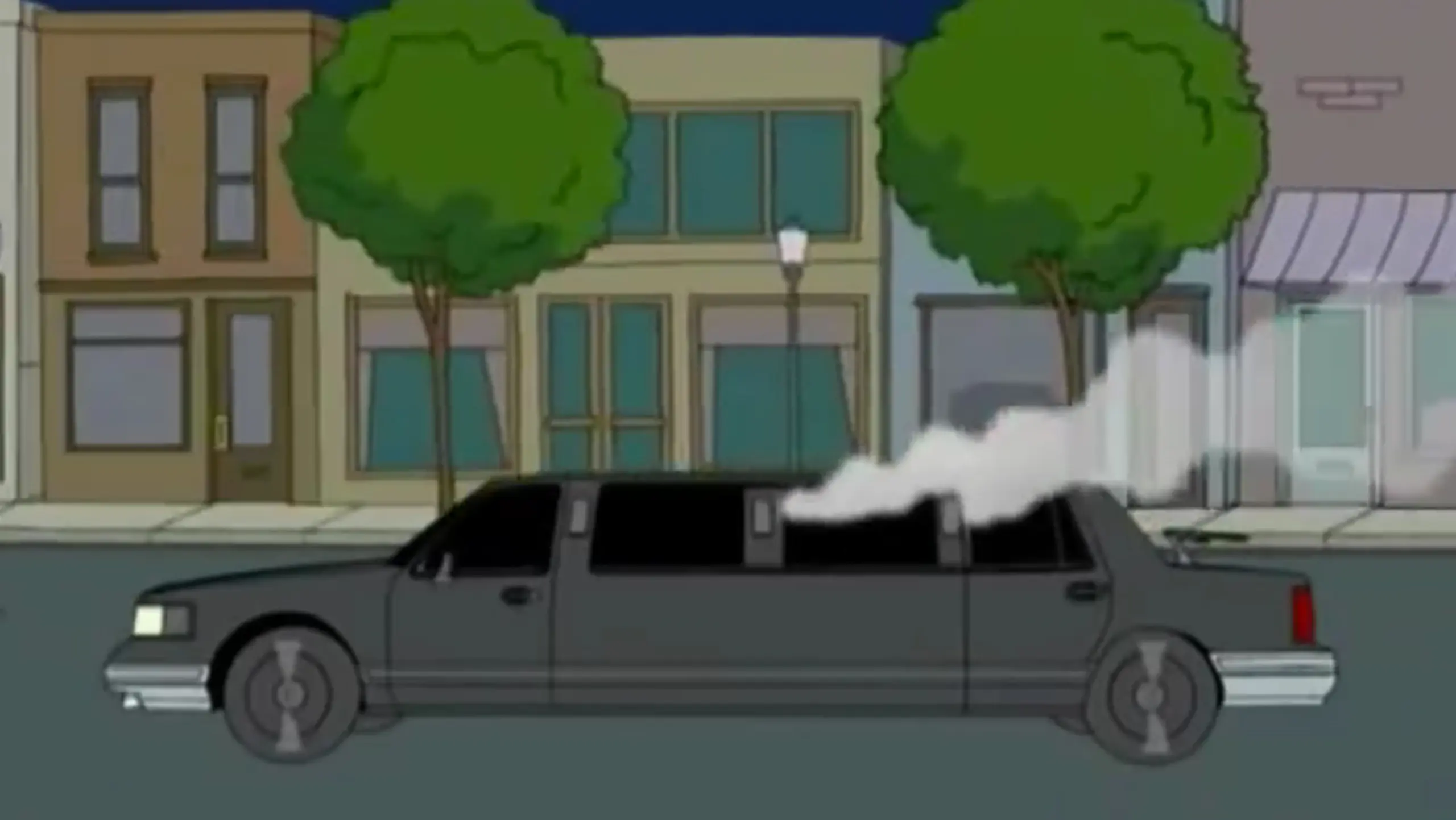 Bill Clinton bleibt mit seiner Stretchlimousine vor dem Haus von Peter liegen. Peter will ihm helfen. Das Nummernschild bezieht sich auf die Herkunft von Bill Clinton aus den Südstaaten. In den USA hat der Ex-Präsident den Spitznamen „Bubba“, was in den Südstaaten für „Brother“ steht.