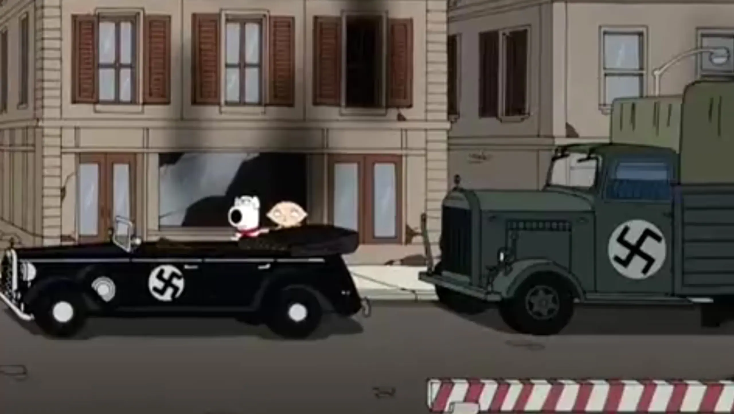 Als Stewie, Brian und Mort Goldman, der jüdische Apotheker, in der Zeit zurück nach Nazi-Deutschland reisen darf ein Mercedes nicht fehlen.