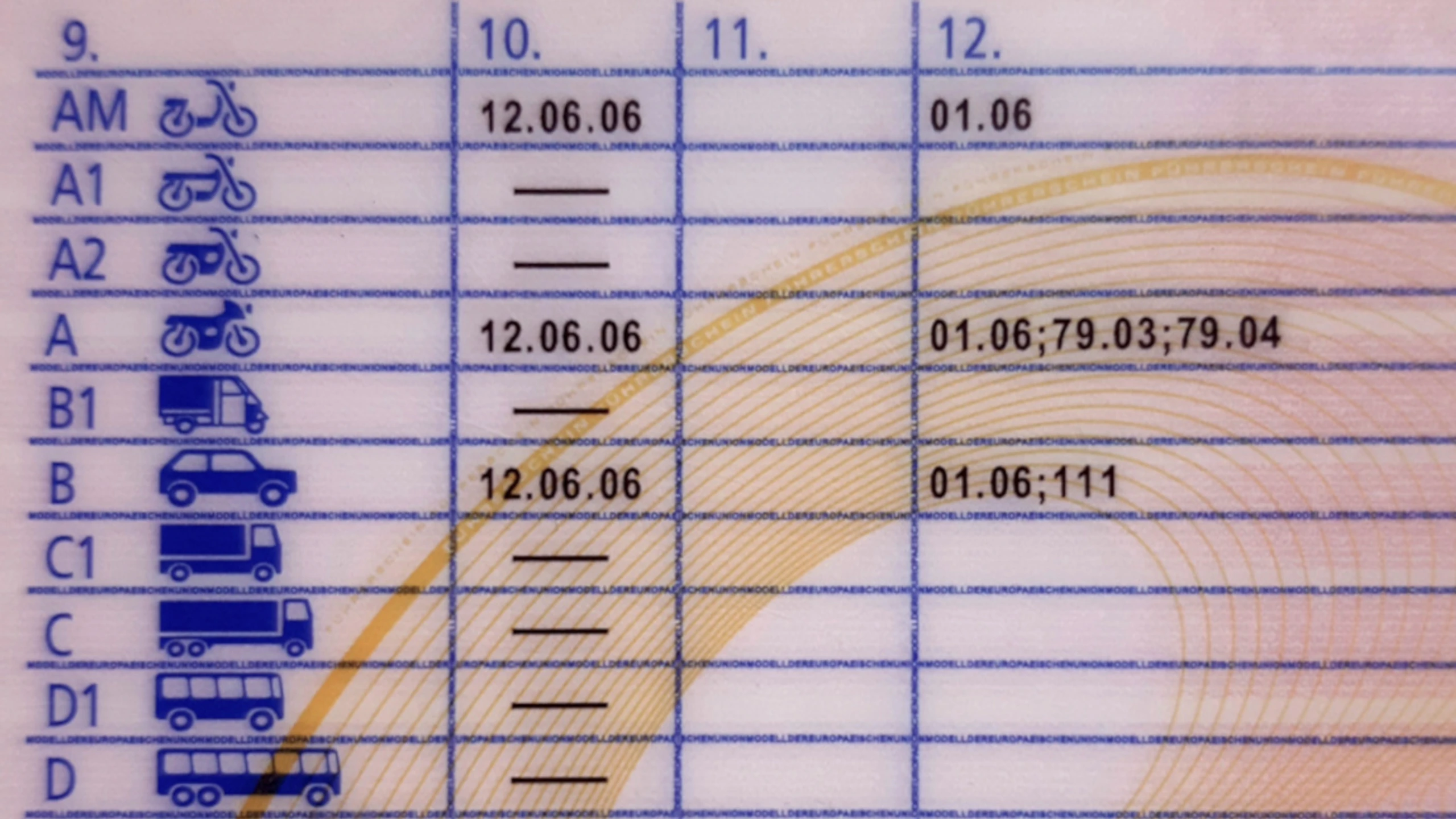 Auf der Rückseite des Scheckkartenführerscheins finden sich unter anderem die Fahrzeugklassen, die der Führerscheininhaber zu lenken berechtigt ist, inklusive Gültigkeitsdatum; sowie gegebenenfalls Zahlencodes für etwaige Zusatzangaben oder Einschränkungen.